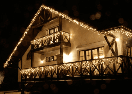 Крыша и фасад: Статичная светодиодная “Бахрома” непрерывного свечения теплого белого цвета.