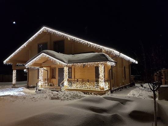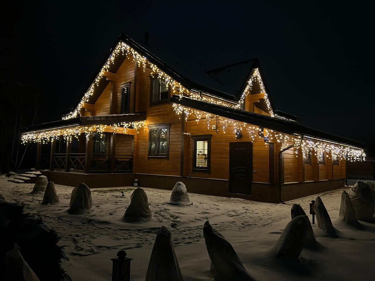 Крыша и фасад: Статичная светодиодная “Бахрома” непрерывного свечения теплого белого цвета.