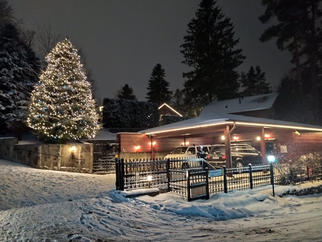 Передняя часть участка: Украшение елей нитями тепло-белого свечения.