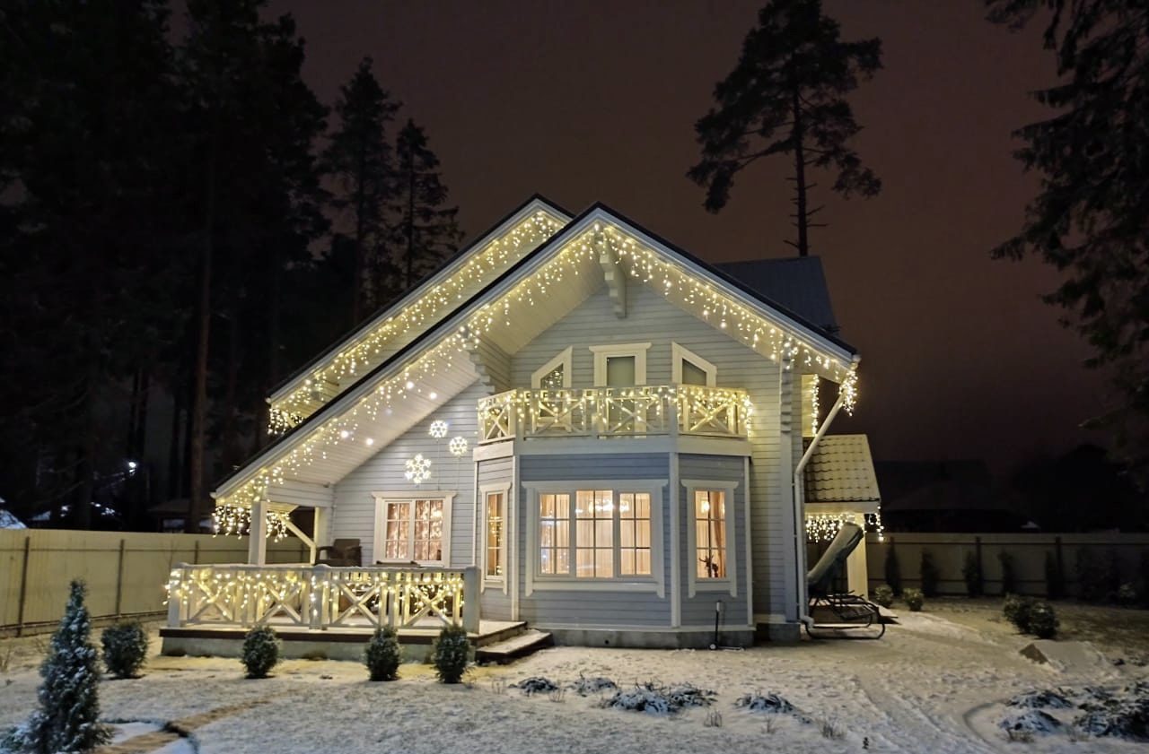 Крыша и крыльцо: Светодиодная бахрома теплого белого цвета и снежинки разноразмерные по периметру дома